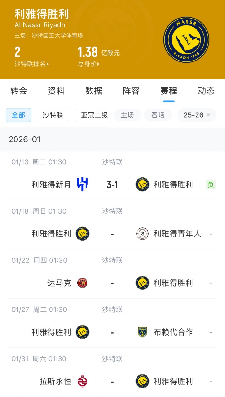 利雅得胜利后续赛程↓