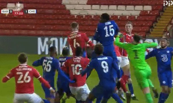 77'巴恩斯利任意球机会,凯帕人群中击球不远,亚伯拉罕门线处将对方补射解围